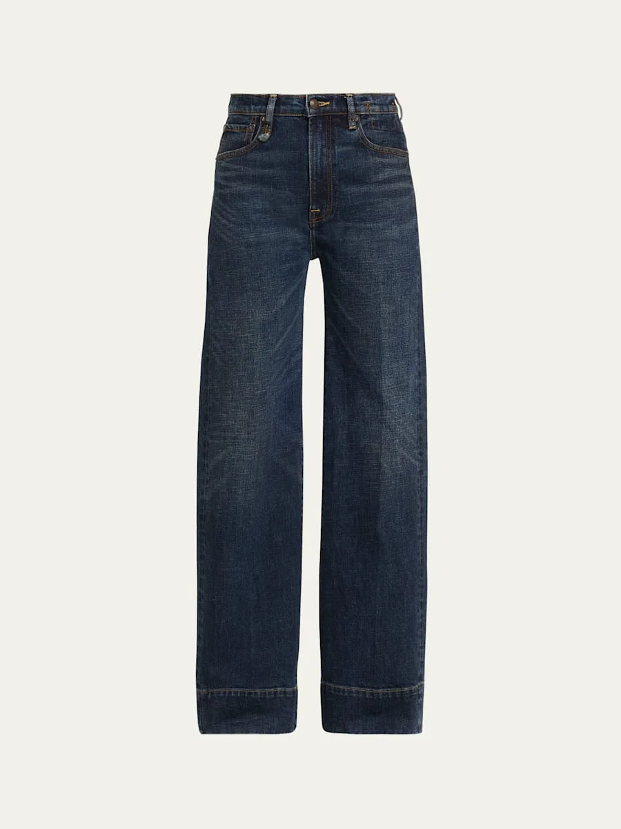 R13 "Pauline" jeans finished with a wide hem in stretch denim High rise Fivepocket style Wide legs Full length Button/zip fly; belt loops Cotton/polyurethane Dry clean Imported