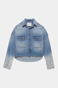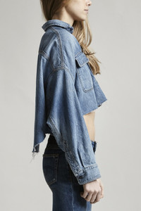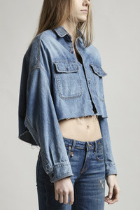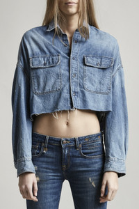 - Color: Brindley - Oversized button up denim shirt - Two bust pockets - Cropped in front, longer back - Model is 5'11" and wearing size M - Bust 34"; waist 24"; hips 35" - 100% CO - Machine wash - Made in Italy - R13W3163-243