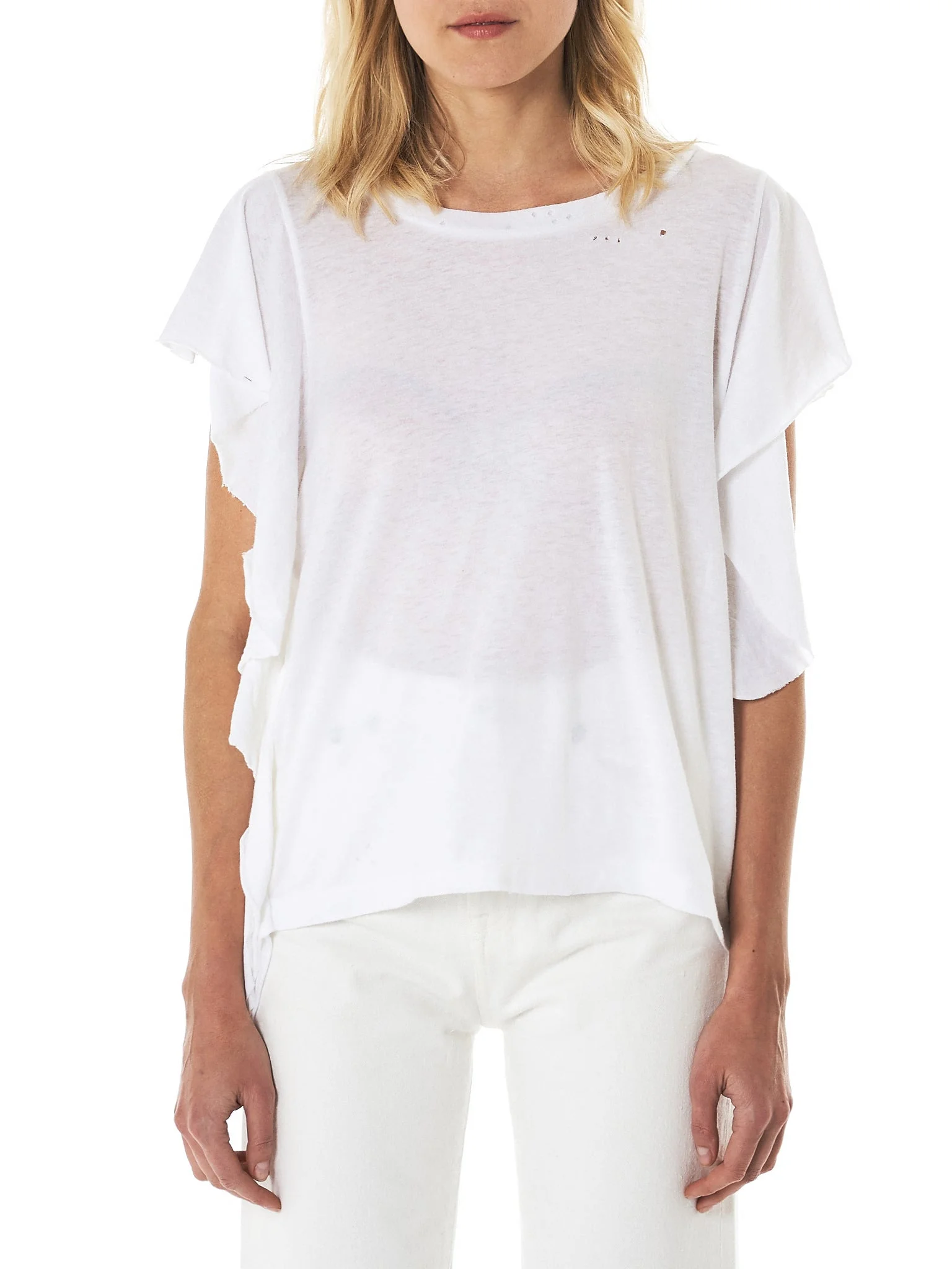 R13 crewneck flutter t-shirt in white, regular fit, raw trim throughout, split cap sleeves, straight hem, tonal stitching. Composition - 100% Cotton Model wears a size S.