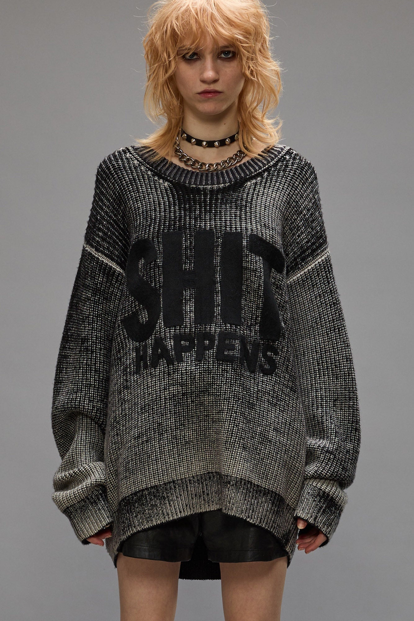 Relaxed fit boyfriend sweater built from reverse printed black yarn and featuring a needle punched "Shit Happens" graphic. - Color: Distressed Black - 100% Merino Wool - R13WY199-Y158B - Imported