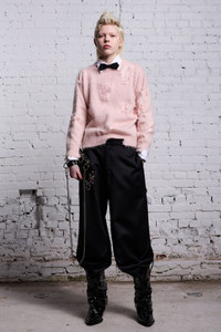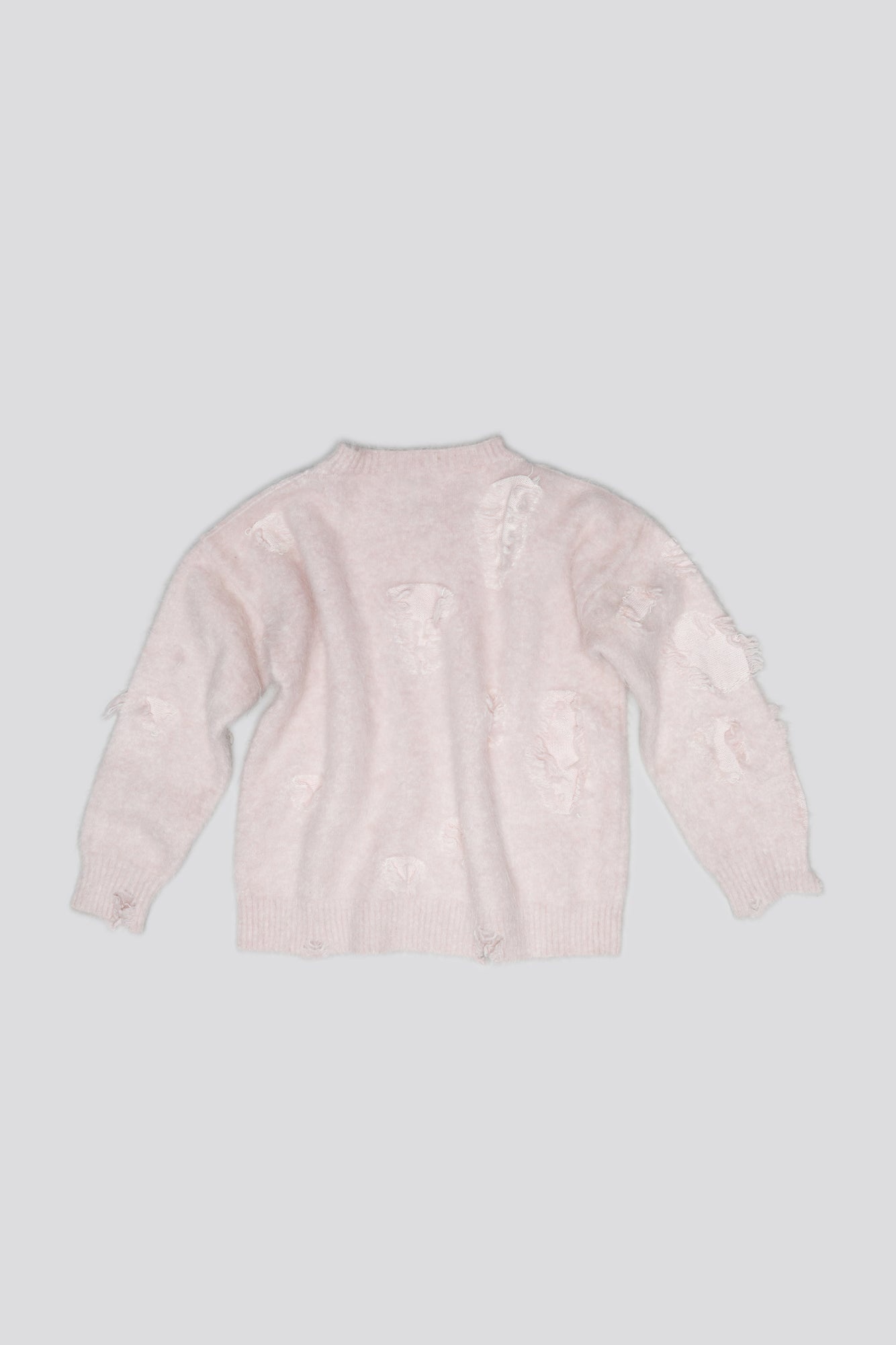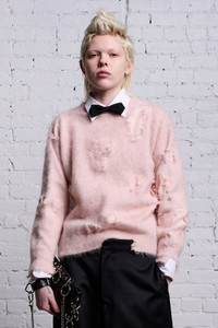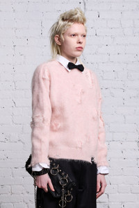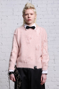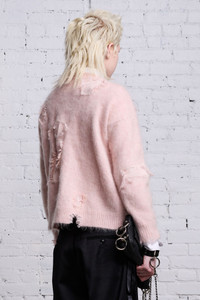 Shrunken fit mohair sweater featuring a brushed texture and heavily distressed patches all throughout the garment. - Color: Light Pink - Mads is 5'9" and wearing size M - Bust 32"; Waist 24"; Hips 32" - 34% Kid Mohair; 34% Wool; 27% Polyamide Fiber; 5% Elastane - R13WY174-Y105B - Imported