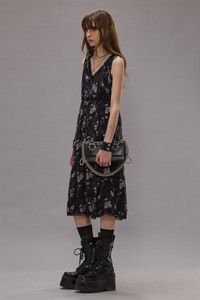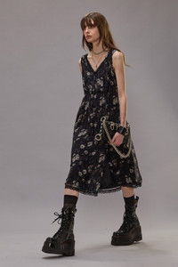 Relaxed fit v-neck midi dress featuring a printed floral pattern and lace trimming around the neck and hem. This style runs small. We recommend sizing up. DETAILS Made in Italy Color: Black Floral 100% Silk R13WR476-R589A