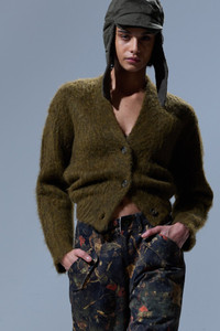 Wool blend cardigan with a tapered split hem for a cinched dramatic opening. DETAILS Color: Heather Olive Green 64% Alpaca, 27% Wool, 9% Polyamide R13WY296-Y207B Imported