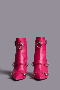 Leather ankle heeled boot with harness straps throughout. DETAILS Heel Height: 3.75", 95 mm Shaft Height: 5.9", 15 cm Shaft Circumference: 7.87", 20 cm Based on size 40; slight variations may occur by size. Made in Italy Color: Bright Pink 100% Leather R13S081-S40A