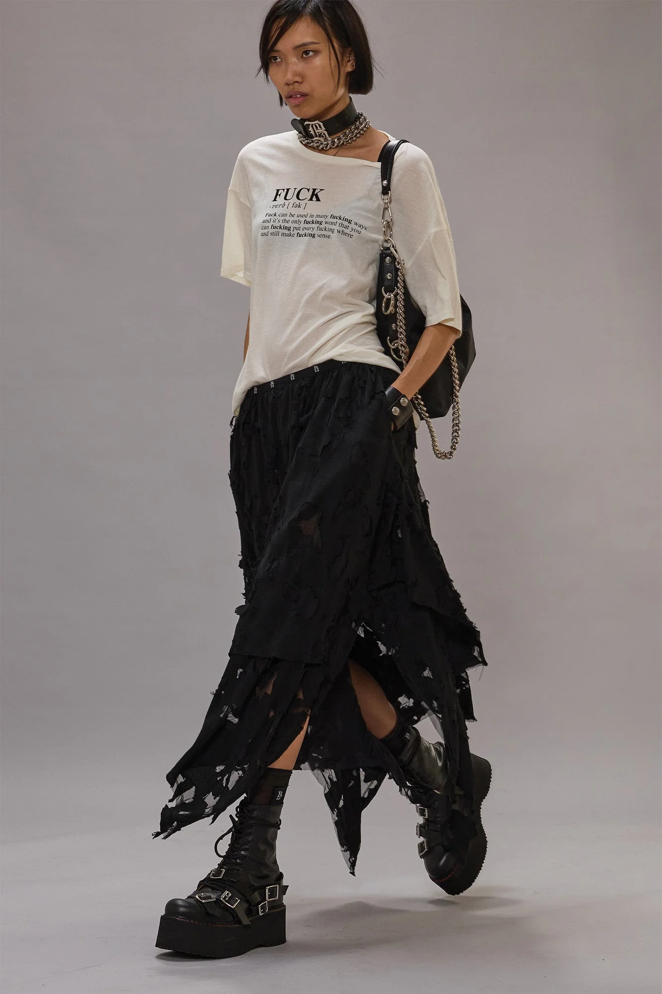 Cotton cashmere relaxed fit Boy T featuring a "Fuck" graphic at the front. DETAILS Color: Ecru 95% Cotton, 5% Cashmere R13WK141-K115B Imported