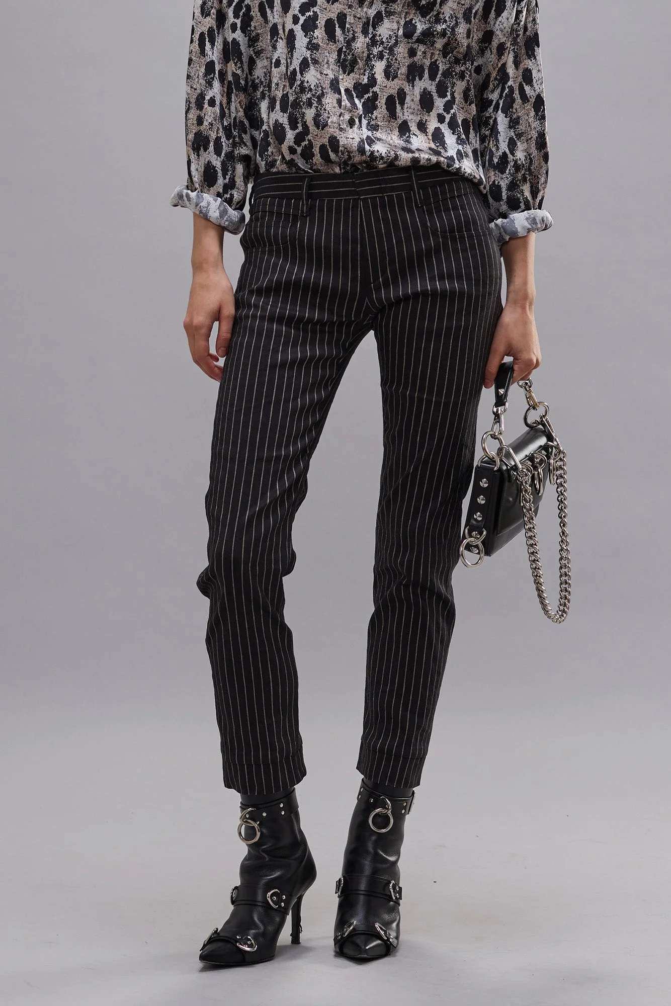Tailored Boy Straight pant made with Italian linen stretch fabric. DETAILS Made in Italy Color: Black Silver Pinstripe 78% Linen, 17% Polyamide, 5% Elastane R13WR586-R717A