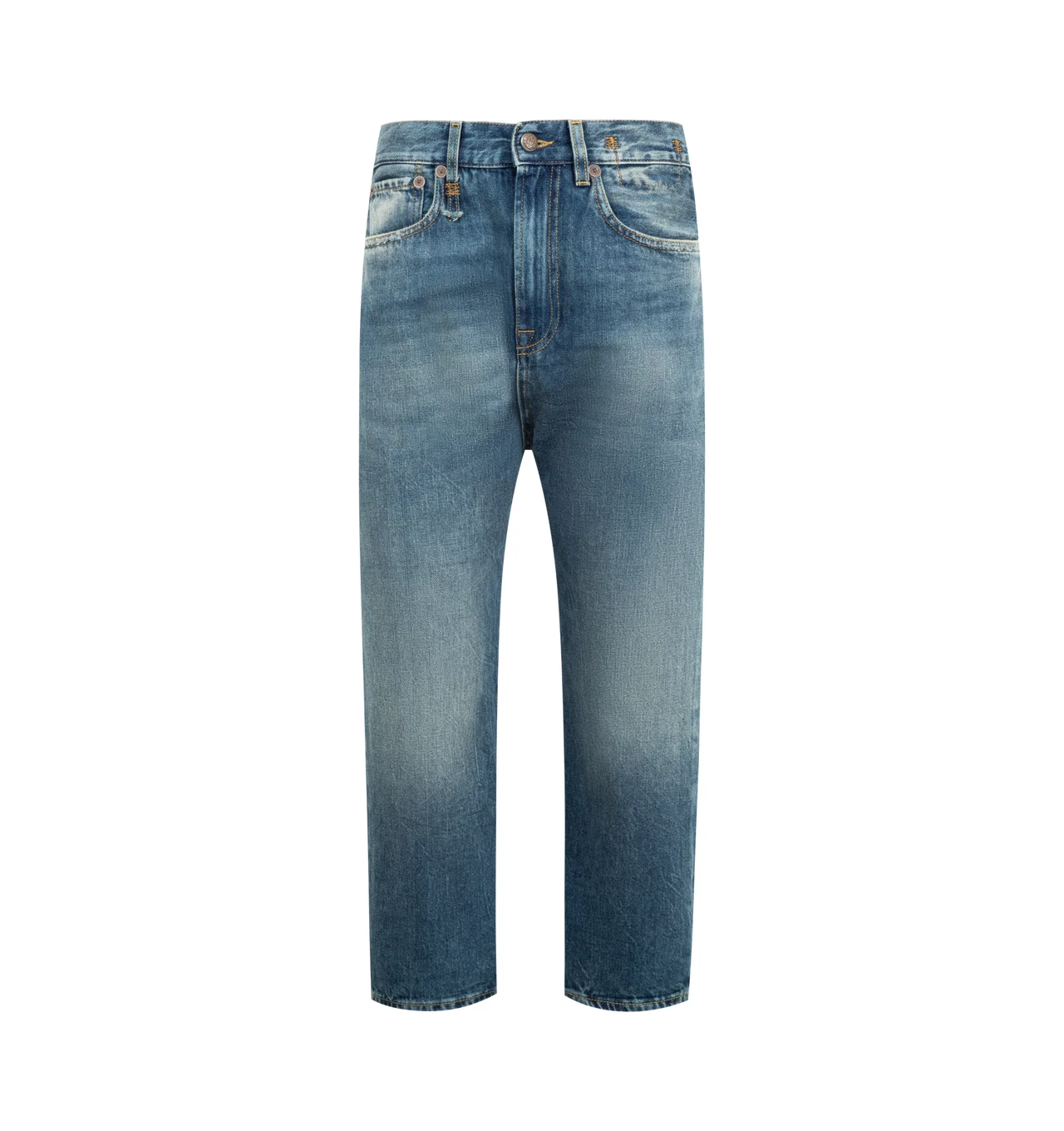R13 Tailored Drop Jeans featuring mid-weight, non-stretch denim, dropped inseam, leather logo patch at back waistband, cropped fit, fading and whiskering, button closure and zip fly and 5-pocket styling. 100% cotton. Made in Italy. DESIGNER STYLE ID: R13W6452-797A COLOR: KELLEN BLUE