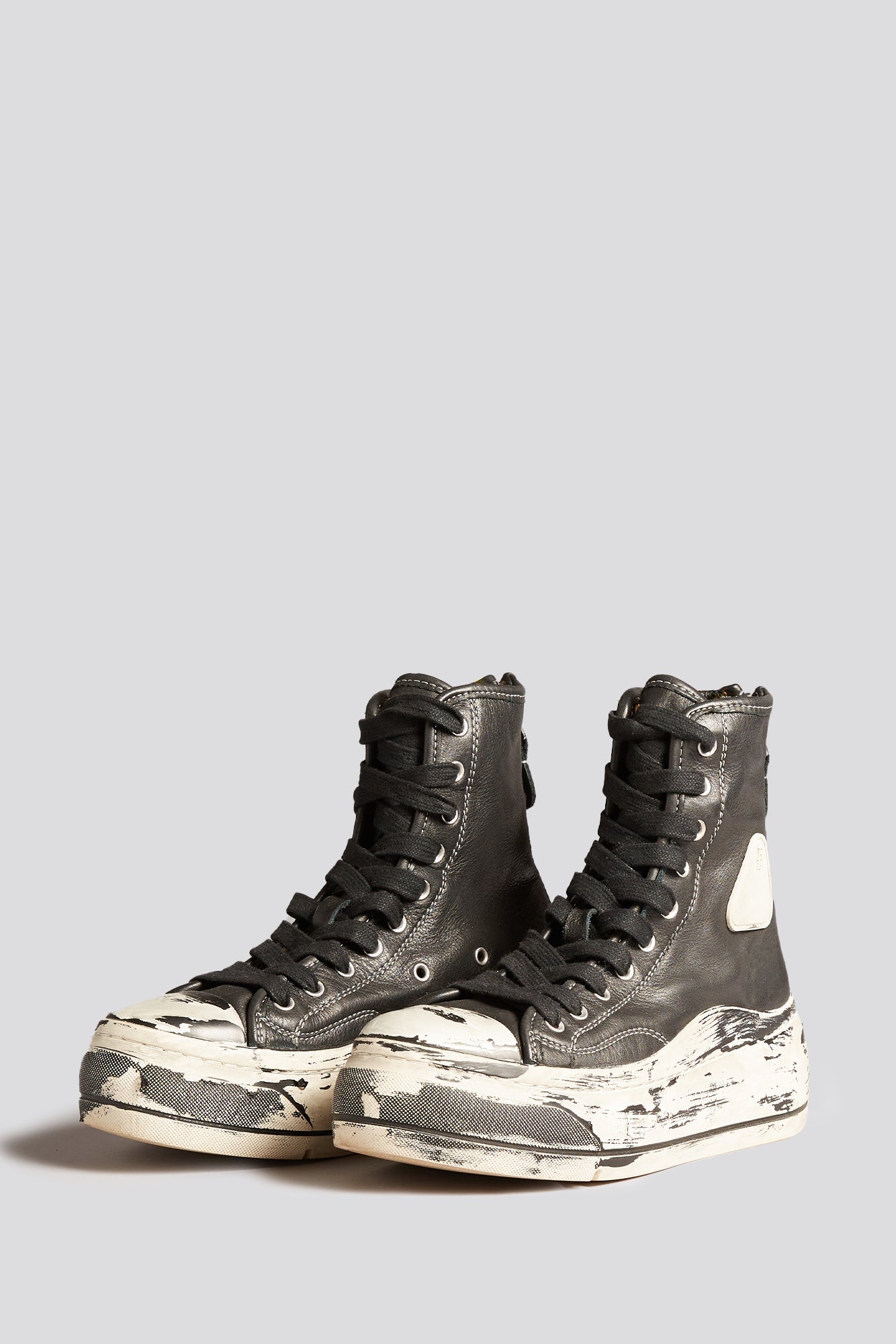 R13's classic Kurt High Top sneaker, featuring the signature chunky sole and rubber R13 patch at the side. The sole of this variant features a scratched off paint effect. - Color: Scratch Paint Black - Body: 100% Leather, Sole: 100% Rubber - R13WS057-S133A - Imported