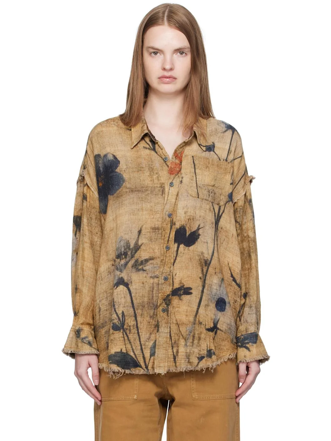 Reversible cotton gauze shirt. Frayed edges and printed floral pattern throughout Reverse in brown cotton gauze. Check pattern throughout. · Spread collar · Button closure · Patch pocket at chest and interior · Shirttail hem · Dropped shoulders · Buttoned barrel cuffs Supplier color: Plaid/Khaki floral 100% cotton. Made in Italy 252021F109004