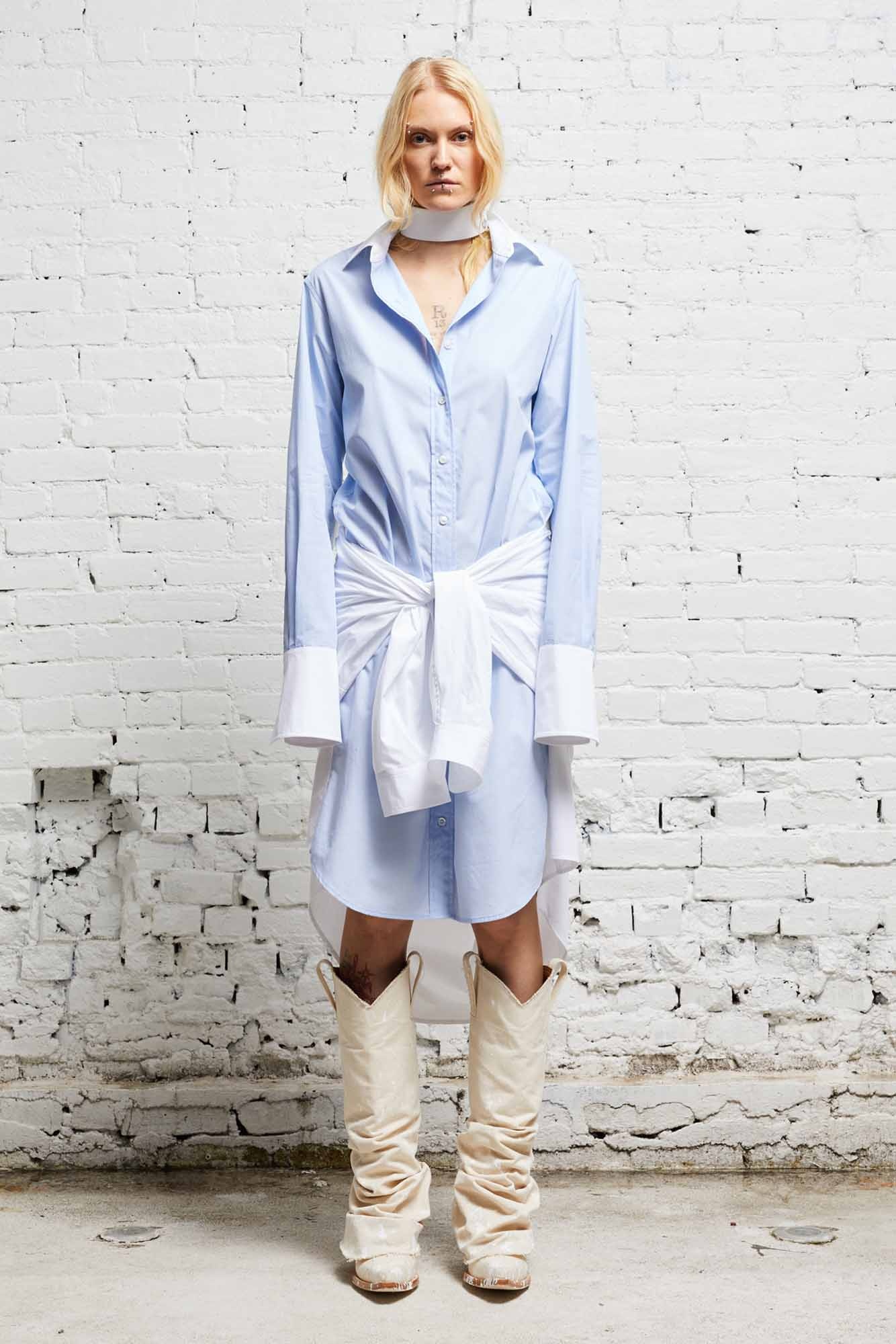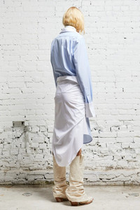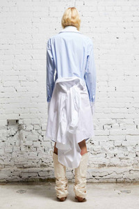 Relaxed shirtdress constructed with two shirts sewn together. The bottom shirt's arms can be tied around the front or back of the waist. - Color: Blue and White - 100% Cotton - Sasha is 5’10” and wearing size M - Bust 32”; Waist 23”; Hips 35” - R13WR182-R280B - Imported