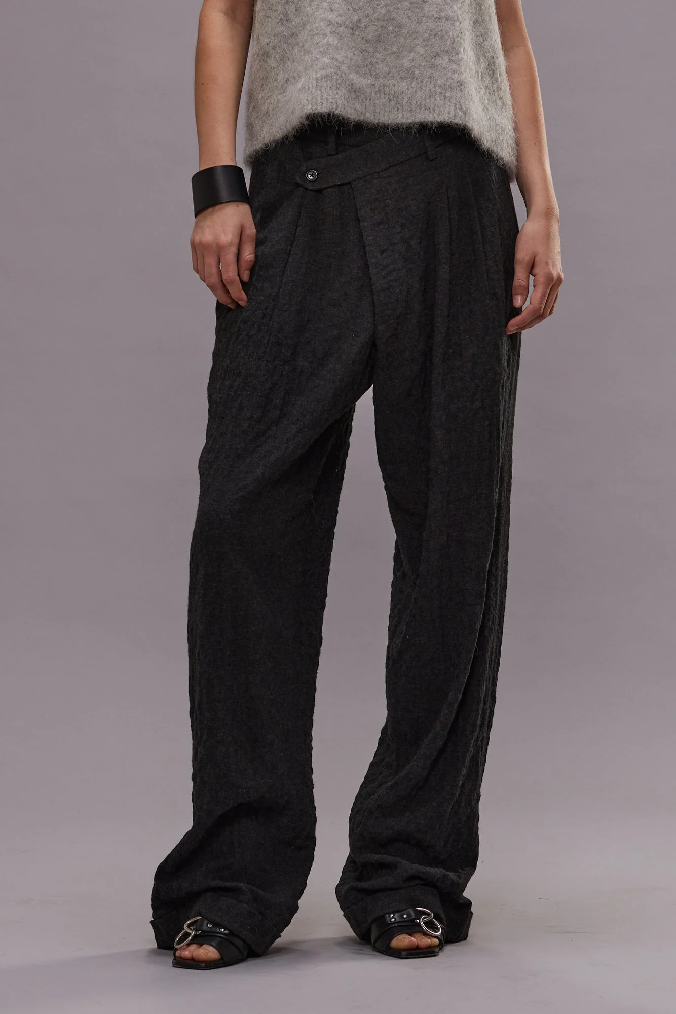 Triple pleated suit trouser based on R13's iconic Crossover jean and built from Italian wool blend crinkle fabric for a uniquely disheveled look. DETAILS Made in Italy Color: Charcoal 55% Viscose, 30% Virgin Wool, 13% Polyamide, 1% Elastane, 1% Polyester R13W7516-R580A