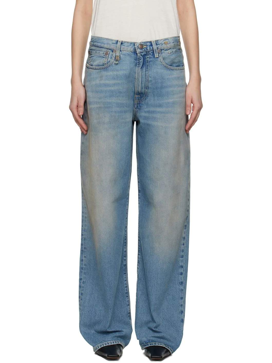 Wide-leg non-stretch denim jeans. Fading, whiskering, and subtle distressing throughout. · Belt loops · Five-pocket styling · Zip fly · Leather logo patch at back waistband · Topstitching at back pocket · Concealed patch pocket at interior waistband · Logo-engraved antiqued copper-tone hardware · Contrast stitching in tan Supplier color: Veiled blue medium wash Body: 100% cotton. Trim: 100% leather. Lining: 65% polyester, 35% cotton. Made in Italy 251021F069045