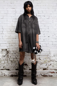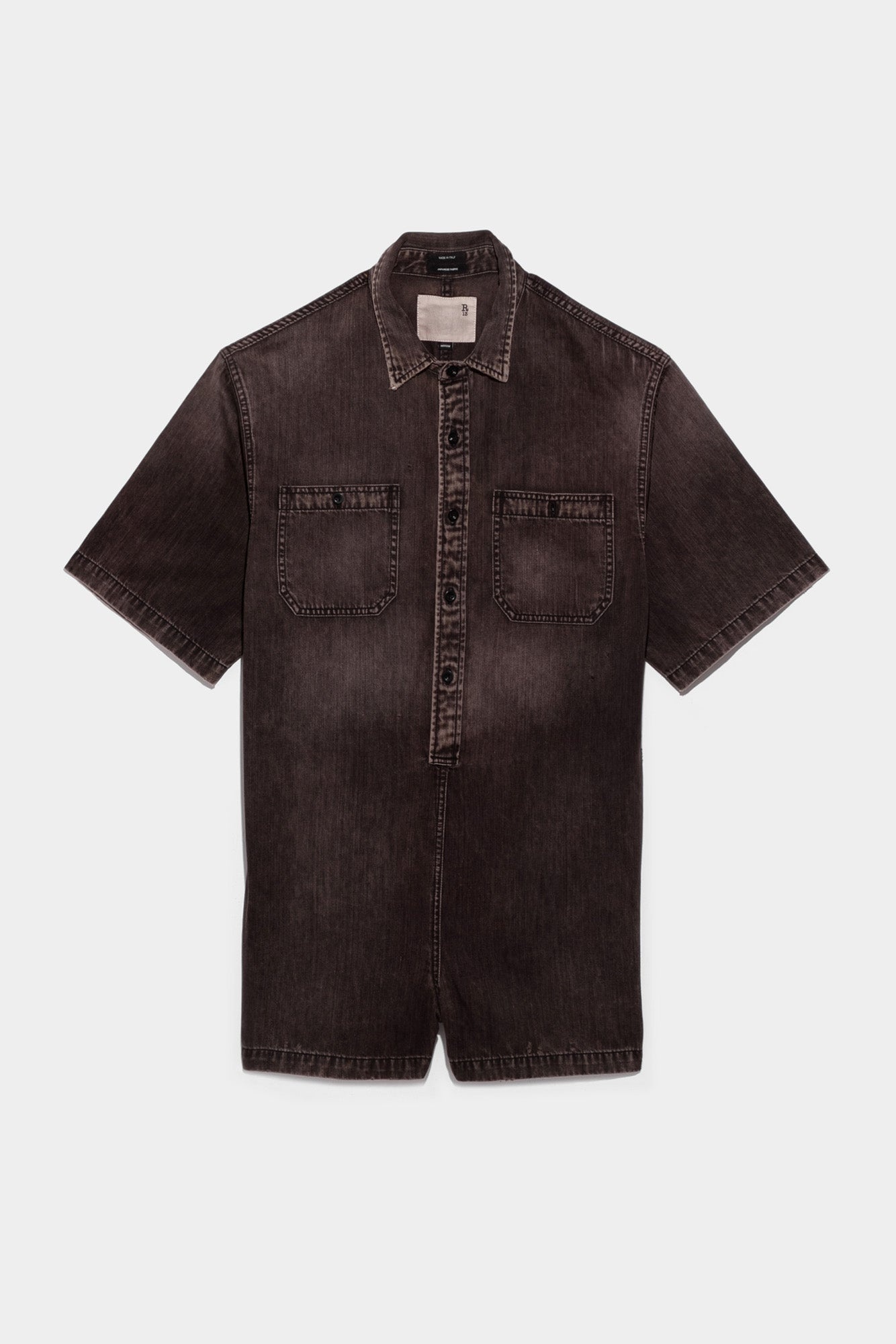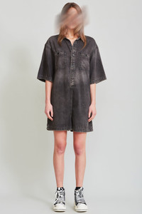 Romper with a vintage black wash and workwear accents. Made with all black soft Japanese denim. - Color: Elmore Black - Model is 5'10 and wearing size M - Bust 34”; waist 24”; hips 35” - 100% cotton - Made in Italy - R13WD031-D019A