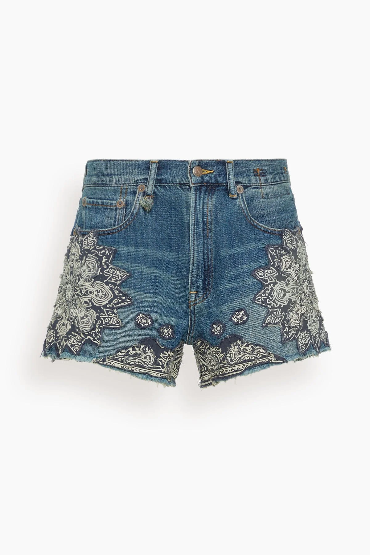 The R13 X-BF Short will quickly become a staple in your spring and summer wardrobe. These denim shorts feature a relaxed fit with a raw hemline with a unique bandana print. Wear yours with a button down and boots. - Denim shorts - Relaxed fit - Mid rise - Raw hemline - Distressing