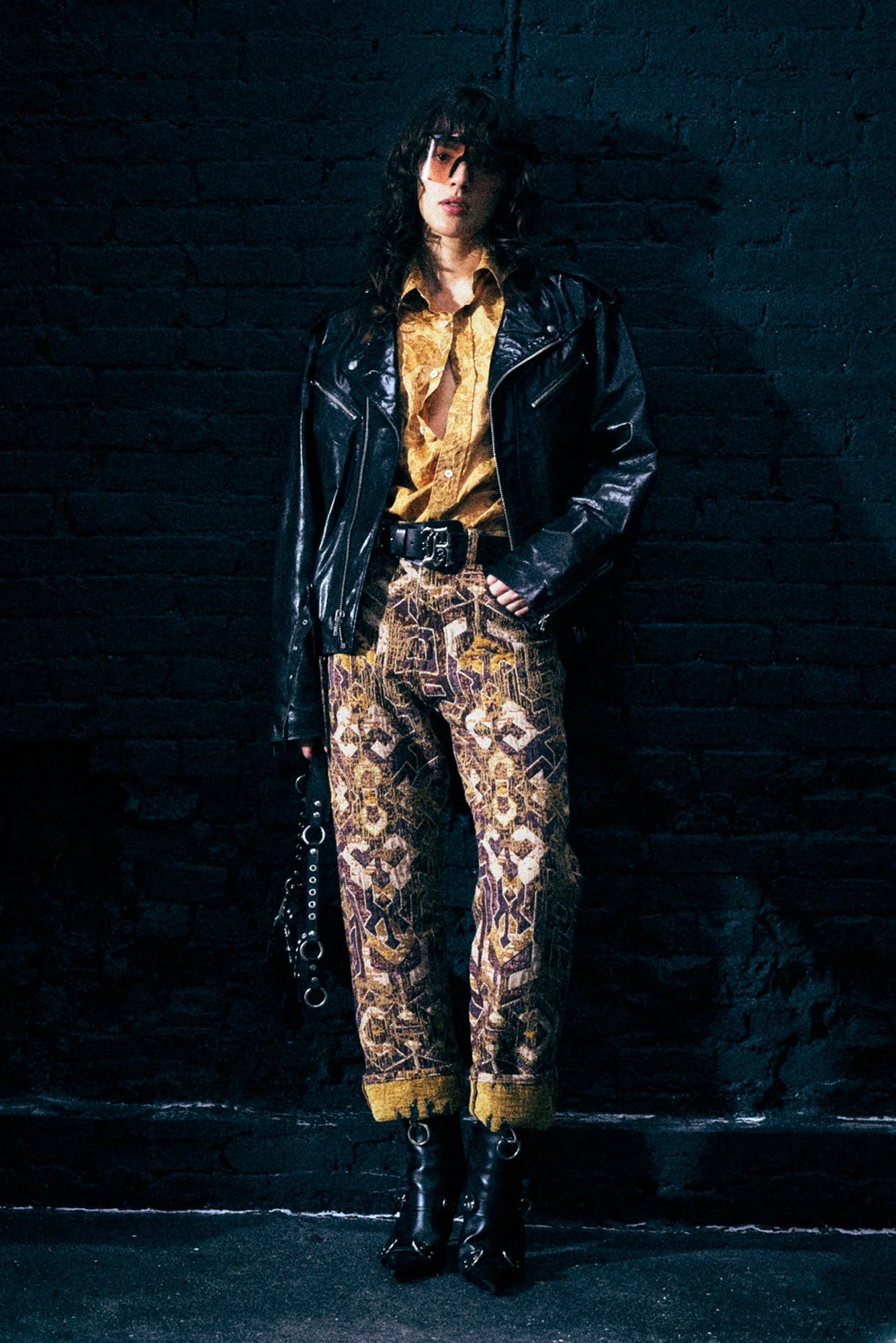 A twist on R13's classic boyfriend jean with a wider, slouchier leg. Made with 11 oz Italian jacquard fabric with geo pattern motif and treated with a stone enzyme wash. FIND YOUR SIZE > DETAILS Made in Italy Color: Geo Brown Jacquard 39% Polyester, 36% Acrylic, 20% Cotton R13WD211-D386A