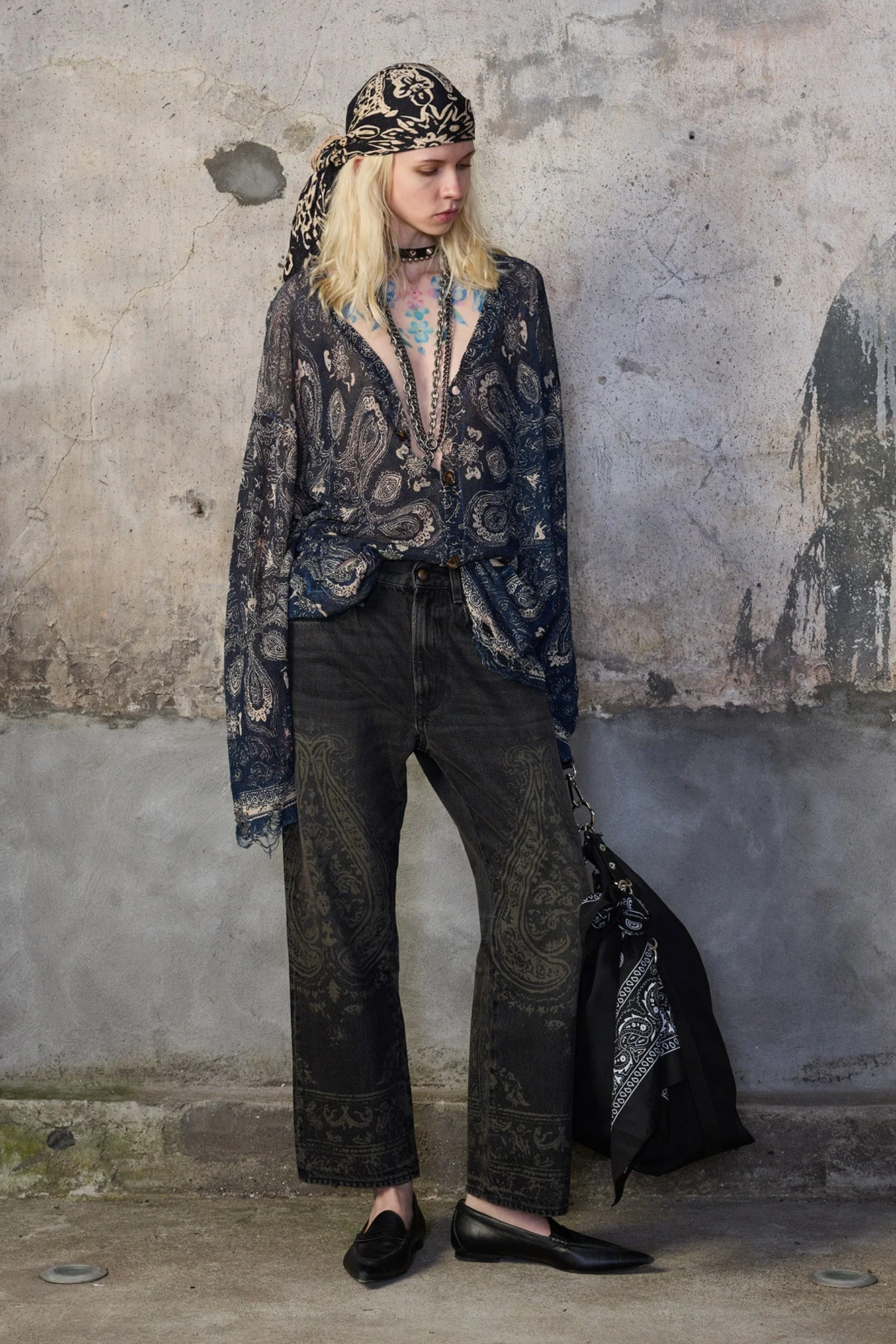 A twist on R13's classic boyfriend jean with a wider, slouchier leg, built with Italian black selvedge denim. FIND YOUR SIZE > DETAILS Made in Italy Color: Baroque Black Selvedge 100% Cotton R13WD111-D442D