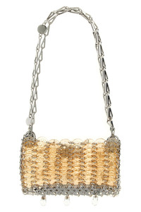 cod. 25HSS0127MET804P665 '1969 Nano Crystal Resin' shoulder bag in metal mesh, semi-transparent resin discs and crystal charms, double sliding handle, magnetic closure. Color: Pink Size & Fit: W 18 x H 10.5 x D 3 cm Composition: 50% synthetic resins 30% pt 20% sst Made in: Madagascar