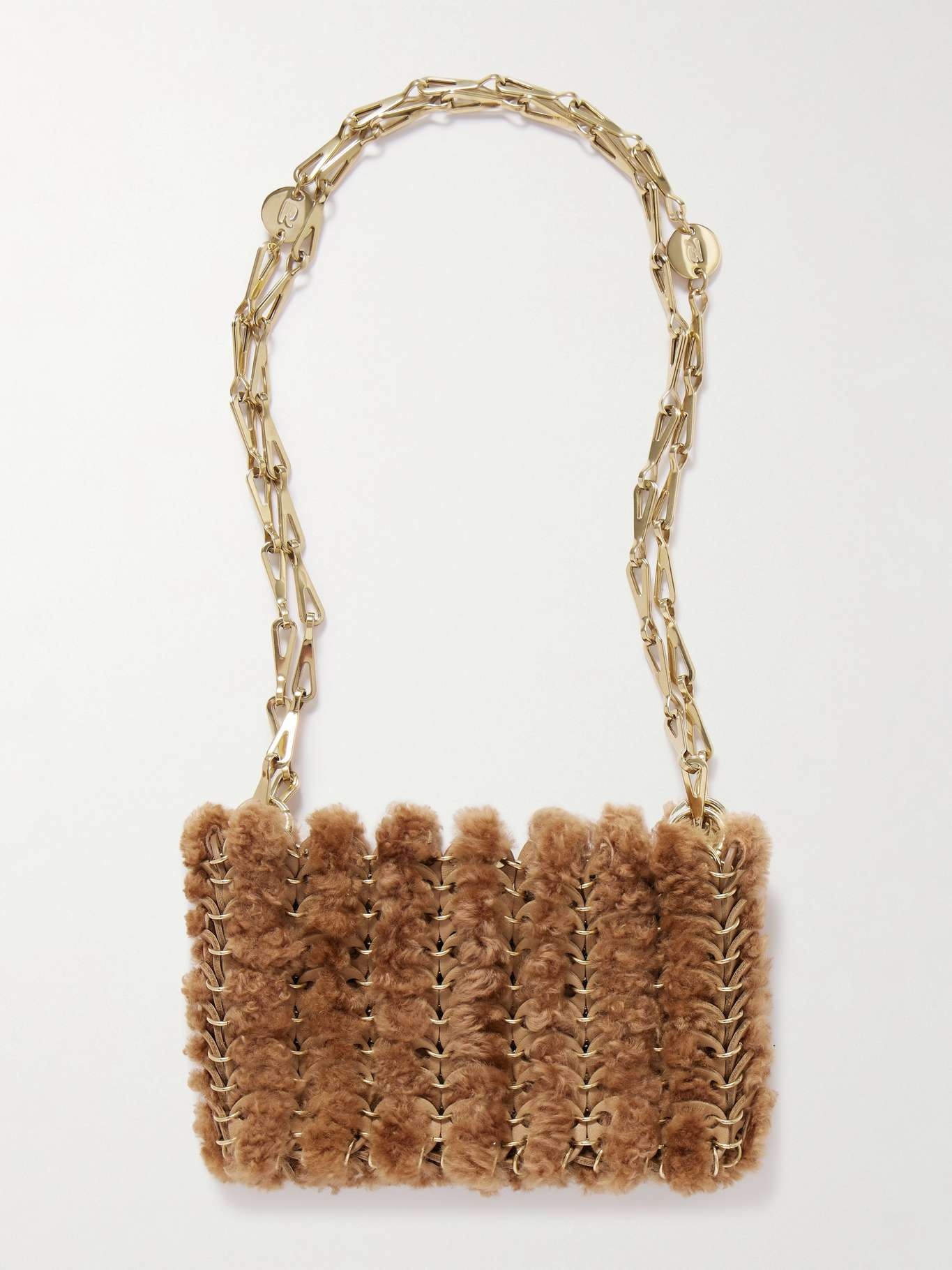 EDITORS'NOTES Rabanne revisits its signature shoulder bag in this covetable '1969 Nano' version. Made from gold-tone metal, it's adorned with leather discs meant to resemble the brand's iconic chainmail. It's topped with fuzzy shearling and strung with an interlinking strap. Store your cardholder, keys and lipstick inside. SIZE & FIT This item’s measurements are: - Min. Strap Length: 87cm / 34.3in - Handle Drop: 44cm / 17.3in - Depth: 4.5cm / 1.8in - Max. Strap Length: 52cm / 20.5in - Height: 12.5cm / 4.9in - Width: 19cm / 7.5in DETAILS & CARE - Tan leather and shearling - Chain shoulder strap - Magnetic fastening at open top - Unlined - Comes with dust bag - Weighs approximately 1.1lbs/ 0.5kg