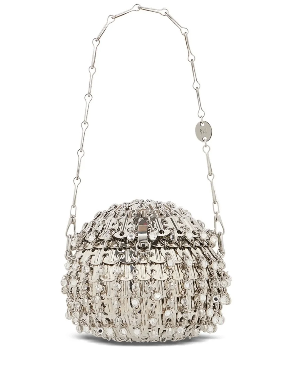1969 Party Ball disc bag Paco Rabanne's 1969 Party Ball bag is a redesign of an archival style. Hand-assembled silver-tone discs overlap to form a hollow spherical structure, which features a hinged lid fastened by a latch buckle. It's suspended from a detachable chain-link strap for custom styling. Highlights - Silver-tone - Brass - Circular design - Disc detailing - Main compartment - Clasp fastening - Chain-link shoulder strap Imported Composition Outer: Brass 100% Washing instructions Do Not Wash/Do Not Dry Clean