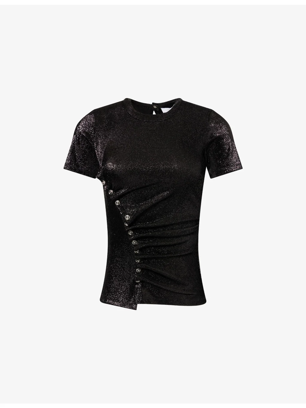 PRODUCT DETAILS - Rabanne stretch-lurex top - 77% viscose, 16% polyester, 7% elastane - Pressed stud fastening at front and back - Regular fit, round neck, short sleeves, embellished buttons at side - Hand wash - Made in Portugal - True to size - Model is 5ft 10in/1.78m and wears a size UK 8 - Lightweight, stretchy Ref: R04551244