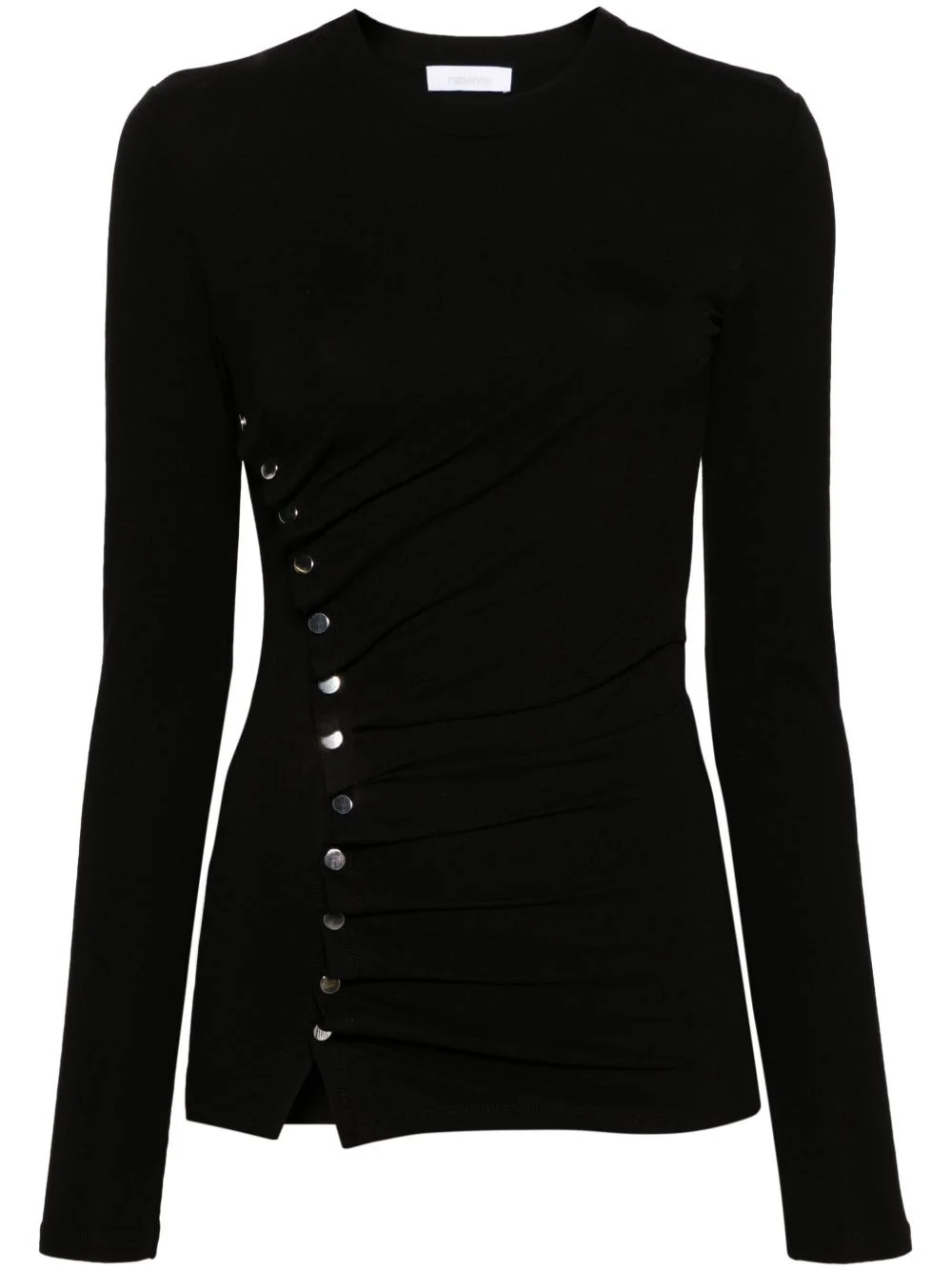 asymmetric studded T-shirt Paco Rabanne transforms the simple silhouette of this long-sleeve T-shirt through the use of ruching details and an asymmetric button fastening. Highlights - Black - Lightweight jersey - Asymmetric design - Gathered detailing - Silver-tone stud detailing - Crew neck - Off-centre front press-stud fastening - Long sleeves - Straight hem Imported Composition Viscose 92%, Elastane 8% SIZE & FIT Model measurements Height 5 ft 9 in(1.76 m) Bust/Chest 31.88 in(81 cm) Hips 35.43 in(90 cm) Waist 24.8 in(63 cm) FittingInformation Designed for a close fit throughout Made from a midweight stretch fabric, this piece offers elasticity and flexibility when worn This piece fits true to size – take your usual size