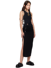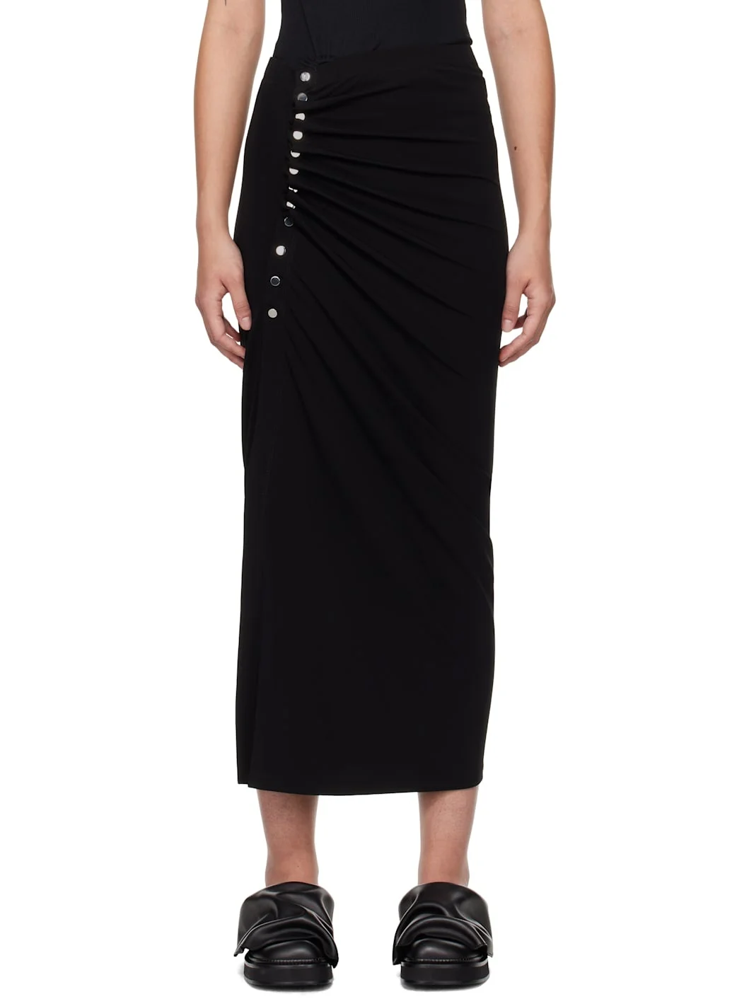 Stretch viscose jersey midi skirt. · Elasticized waistband · Gathering at press-stud closure · Asymmetric hem · Slit at side seam · Logo-engraved silver-tone hardware Supplier color: Black 95% viscose, 5% elastane. Made in Portugal 251605F092000