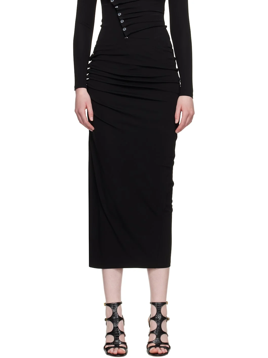 Stretch viscose jersey midi skirt. · Elasticized waistband · Gathering and press-stud closure at side seam Supplier color: Black 95% viscose, 5% elastane. Made in Portugal 252605F092000