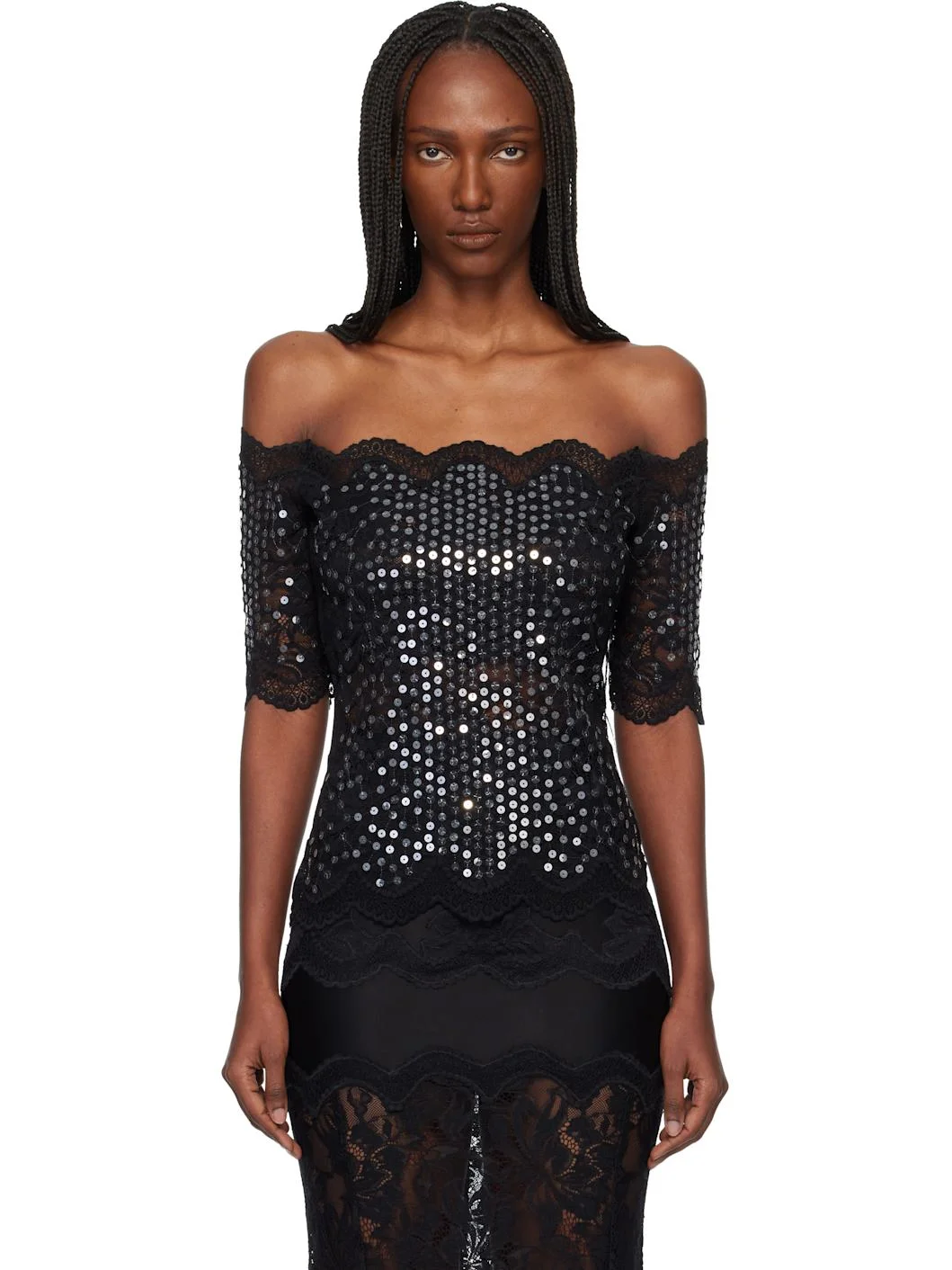 Semi-sheer stretch nylon lace top. · Scalloped edges and sequins throughout · Off-the-shoulder construction Supplier color: Black 90% polyamide, 10% elastane. Made in Portugal 261605F107000