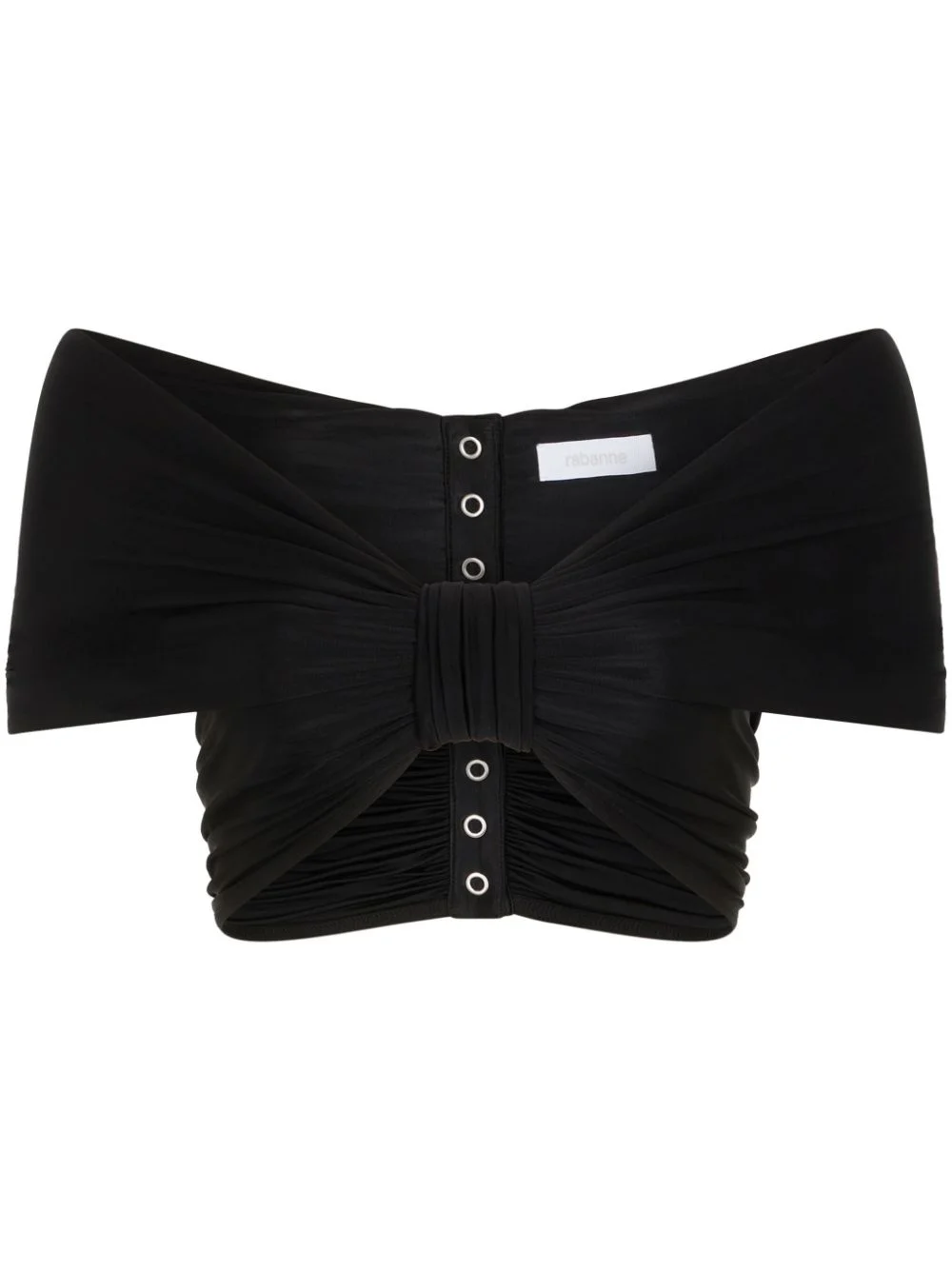 off-shoulder draped top A recurring style from Rabanne, this top is defined by its cropped off-shoulder silhouette. This iteration is crafted from draped jersey and fastens with press studs on the front and back. Highlights - Black - Stretch-design - Draped design - Off-shoulder - Short sleeves - Front press-stud fastening - Cropped Imported Composition Viscose 90%, Elastane 10% Washing instructions Read Manufacturer Guidelines