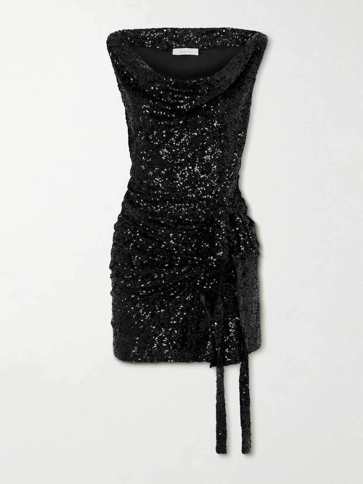 Rabanne's mini dress glitters with scores of sequins, so you're sure to light up the room when and wherever you wear it. Designed with a slinky cowl neckline, it's gathered through the body and adorned with a bow below the waist. Style yours with sandal heels or knee boots.