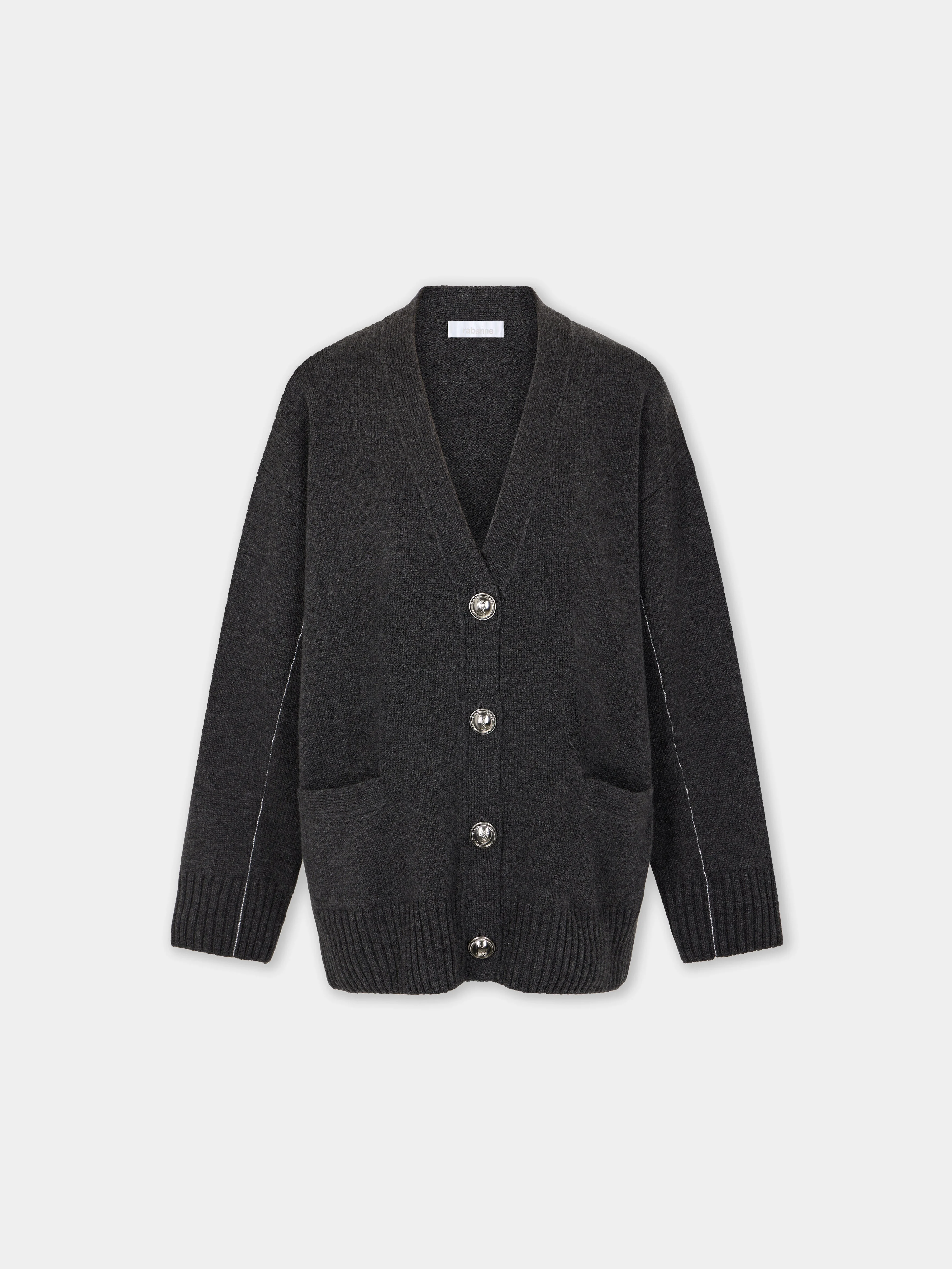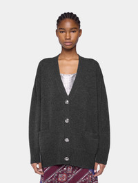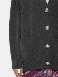2 pockets on the front of the cardigan. Closure with 4 silver buttons. - Color : Dark grey - V neckline - Long sleeves - 2 pockets on the front of the cardigan. - Closure with 4 silver buttons. DETAILS - Composition : 90% Merino Wool, 10% Cashmere - Made in Romania - Model's height: 180 cm / 5ft 11in - Model wears a size FR 36 / UK 8 / US 4 - This style is true-to-size - We recommend your usual size.