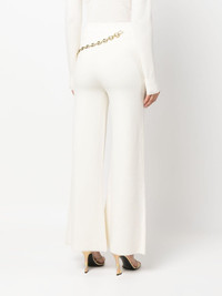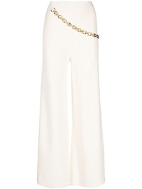 chainmail-detail wool-cashmere trousers Highlights - Ecru - Wool-cashmere blend - Knitted construction - Gold-tone hardware - Chainmail effect - Wide leg Imported Composition Merino 58%, Cashmere 25%, Polyamide 13%, Elastane 4% SIZE & FIT Model measurements Height 5 ft 11 in(1.8 m) Bust/Chest 33.07 in(84 cm) Hips 37.4 in(95 cm) Waist 25.19 in(64 cm) FittingInformation Designed with a wide-leg cut, these trousers allow for a close fit at the waist and offer a loose and roomy fit over the leg The elasticated waist allows for a comfortable fit Made with a midweight knit, this piece offers some stretch This piece fits true to size – take your usual size Washing instructions Hand Wash