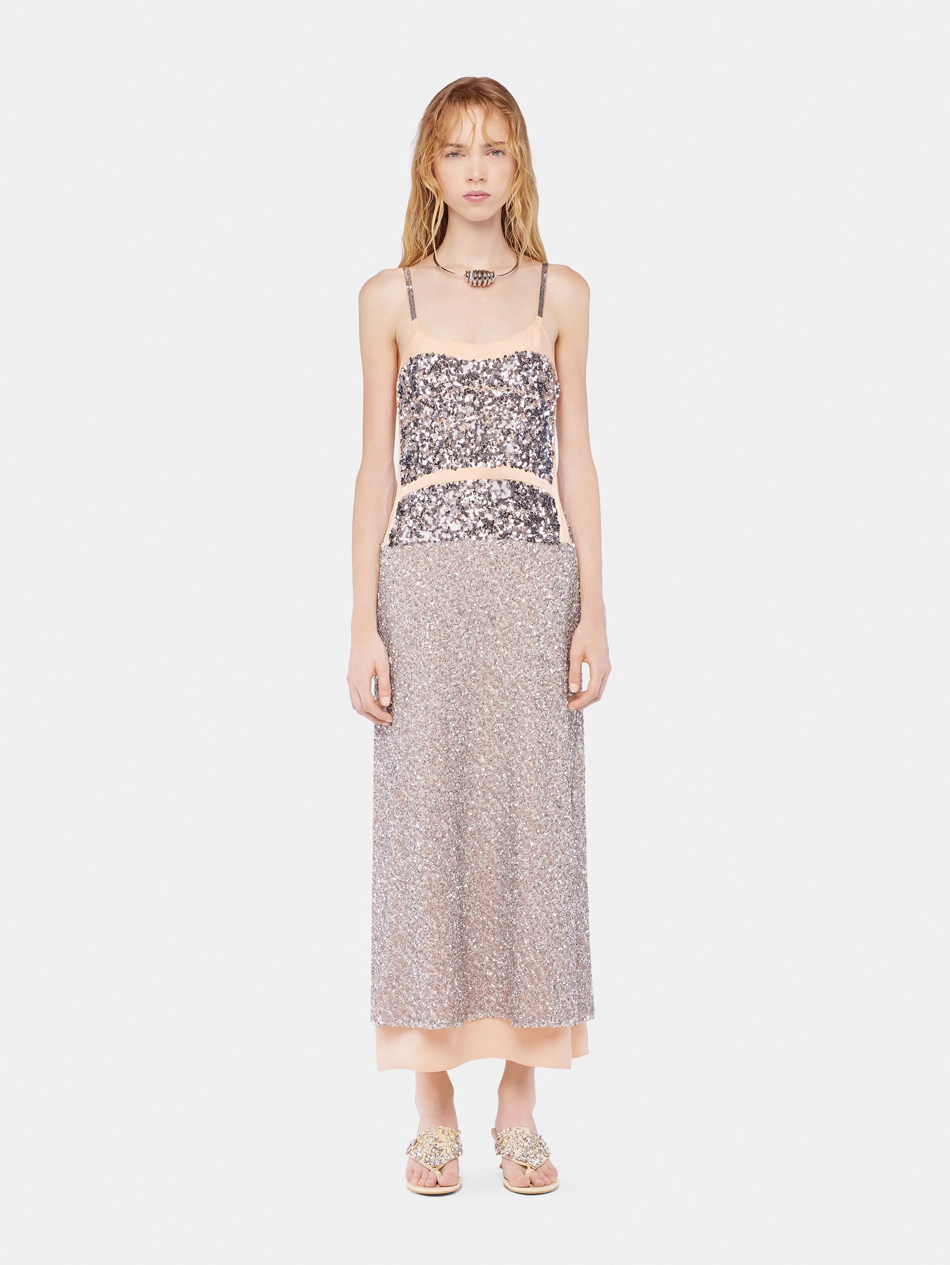 Chiffon dress with straps embroidered with silver sequins. - Color: Silver / Peach - Sleeveless - V-neck collar - Long dress - 100% Polyester - Made in Madagascar Size & Fit - Model's height: 180 cm / 5ft 11in - Model wears a size FR 36 / UK 8 / US 4 - This style is true-to-size - We recommend your usual size.