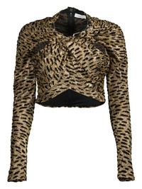 animal-print long-sleeve top Highlights - Black and gold-tone - All-over animal print - High neckline - Gathered detailing - Rear zip closure - Fitted long sleeves Made in Italy Composition Viscose 50%, Nylon 40%, Polyester 5%, Elastane 5%