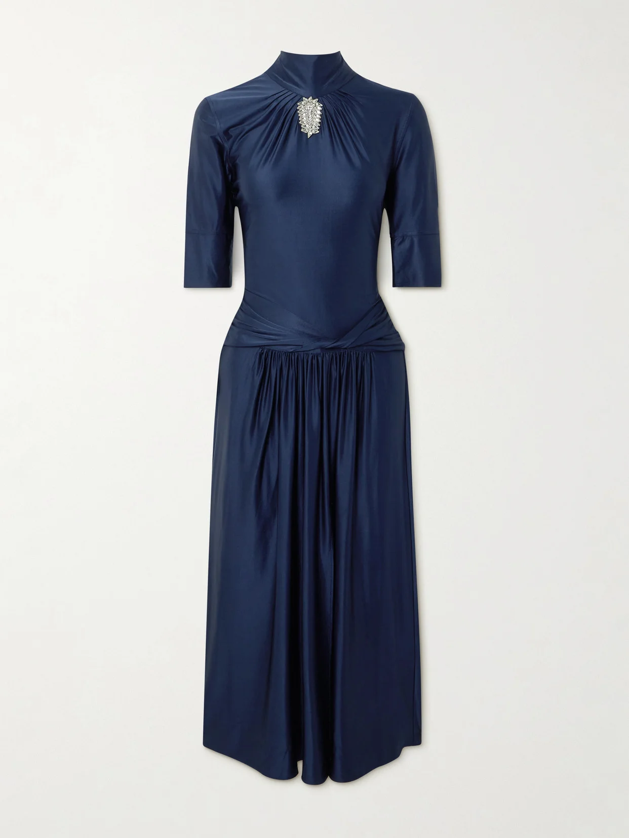EXCLUSIVE AT NET-A-PORTER. Our exclusive collection with Rabanne is inspired by the sophistication of 1970s Miami. This dress is made from slinky satin-jersey with gathering at the high neckline and waist. It's embellished with pear- and round-cut crystals to resemble a brooch, so you can keep styling to a minimum.