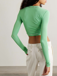 Cropped embellished gathered jersey top Light green