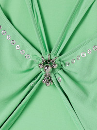 Rabanne’s top is cut from soft jersey and detailed with bold cutouts and a cropped hem, both outlined in eyelets for added edge and structure. Gathered at the center, it’s finished with sculptural ball pendants that nod to the house’s iconic hardware-driven aesthetic. Size & Fit - Fits true to size, take your normal size - Intended for a close fit - Cropped length - Lightweight, heavily embellished, stretchy fabric - Model is 175cm/ 5'9" and is wearing a FR 36 Details & Care - Light-green jersey - Slips on - 78% viscose, 17% polyamide, 5% elastane