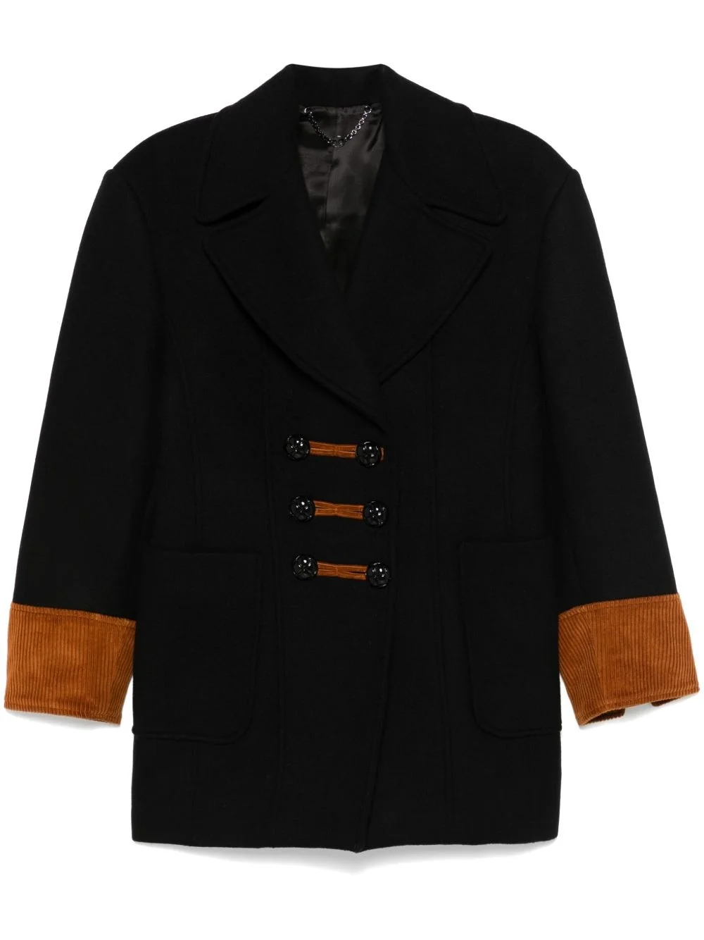 double-breasted coat Highlights - Black/camel brown - Virgin wool blend/cotton - Corduroy detailing - Colour-block panelled design - Double-breasted button fastening - Notched lapels - Shoulder pads - Long sleeves - Split cuffs - Two front patch pockets - Martingale to the rear - Full lining - Internal slip pocket - Straight hem Imported Composition Outer: Cotton 100%, Virgin Wool 75%, Polyamide 25% Lining: Viscose 52%, Cupro 48%
