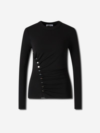 SKU: 703-002462 01 BRAND ID: 24AJT0708VI0386 Draped Top Top By Rabanne • Details of 11 silver metallic snap buttons • Fitted silhouette that enhances the figure • Crafted from a high-quality fine knit fabric • Diagonal front closure • Round neck Composition: 77% Viscose, 21% Polyamide, 2% Elastane Made in: Italy