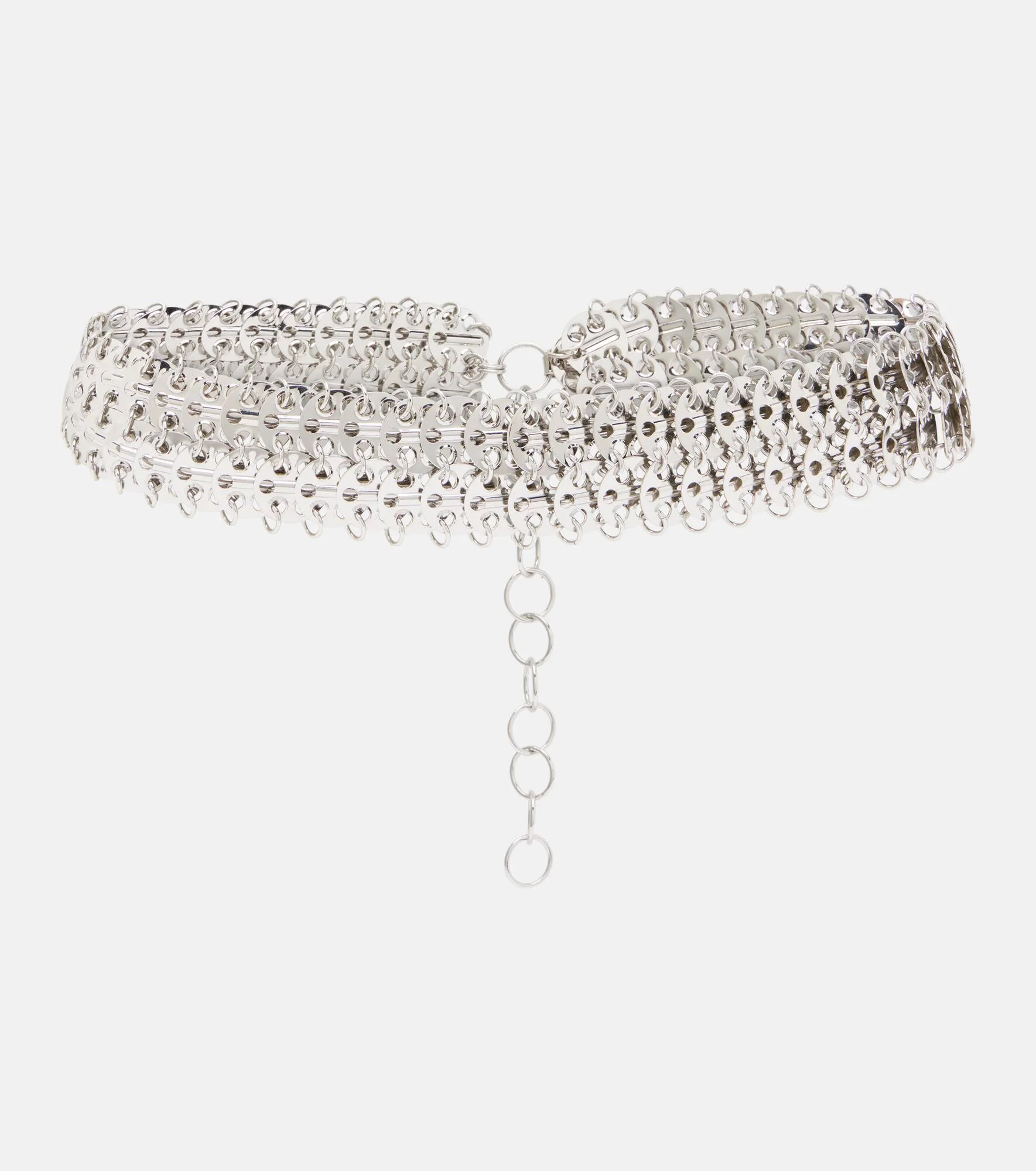 Celebrated for creating glamorous designs with unexpected materials, Rabanne’s innovative spirit continues to break boundaries. This belt is crafted from a tight-knit network of shiny silver-toned pellets and rings. Product Details - Material: brass - Made in France - Item color: silver - Closure: hook - Item number: P01103971 Size & Fit - Adjustable length - Length when open 77/95cm-30.5/37.5" - Width 5cm-2"