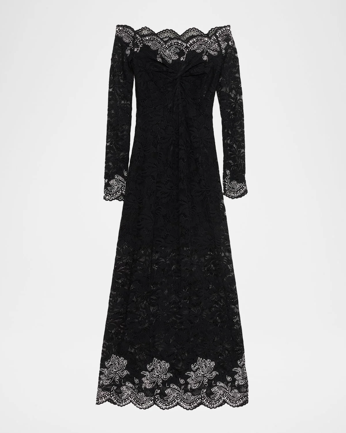 Crafted from sheer lace, this dress from Rabanne features studded embellishment along the neckline, cuffs, and hem Off-the-shoulder neckline Long sleeves Body-skimming silhouette Hem falls below the knee Walking vent back Slipover style Nylon/polyamide/elastane Imported