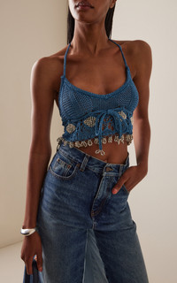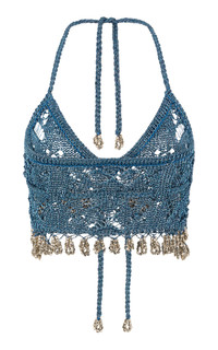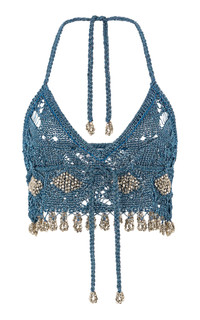 Building off of last season’s layered eclecticism, Julien Dossena channels a British beat, balancing jolts of grunge and a streetwise ease with vintage-inspired luxuries. Woven with metallic accents, this knitted top by Rabanne is designed for an adjustable fit with triangular cups and a close fit to the waist. Complete the look with a mini skirt and gold-tone jewellery. PRODUCT DETAILS - Pre-Fall ‘25 - Tie fastening - Composition: 73% viscose, 14% metallic polyester, 13% paper - Dry clean - Imported