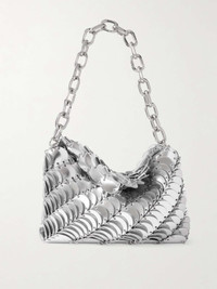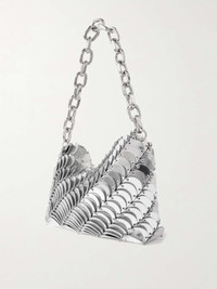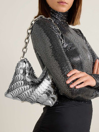 EDITORS'NOTES Interpreting archival chainmail styles, Rabanne's shoulder bag is handcrafted from metallic leather discs linked together with silver-tone hardware. It's set on an industrial-style chain and slopes gently, creating a slouchy profile. SIZE & FIT This item’s measurements are: - Handle Drop: 20cm / 7.9in - Depth: 6cm / 2.4in - Height: 16cm / 6.3in - Width: 23cm / 9.1in DETAILS & CARE - Silver metallic leather (Calf) - Chain shoulder strap - Unlined - Magnetic fastening at open top - Weighs approximately 1.8lbs/ 0.8kg