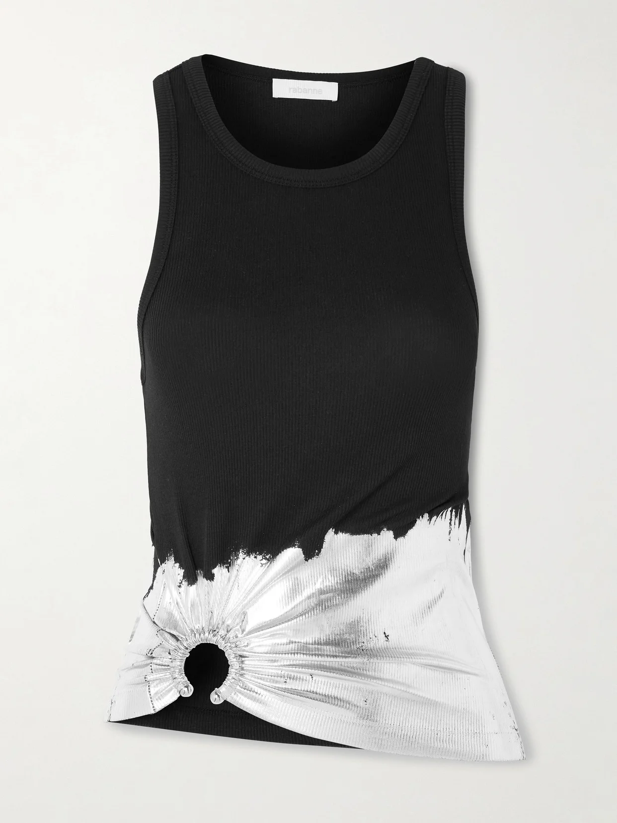 Rabanne's tank top is scrunched with a metal ring at the waist. It's cut from ribbed cotton-blend jersey that looks like it's been dipped in silver-tone paint.