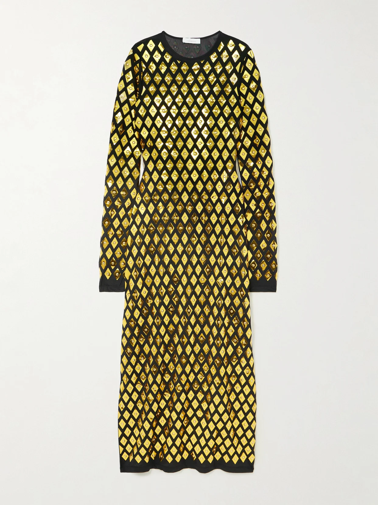 EXCLUSIVE AT NET-A-PORTER. Taking inspiration from chainmail, Rabanne's dress is made from stretch-jersey embellished with diamond-shaped plaques. It's cut in a column shape with a crew neck and midi hemline. Wear yours to parties with one of the brand's statement bags.