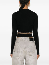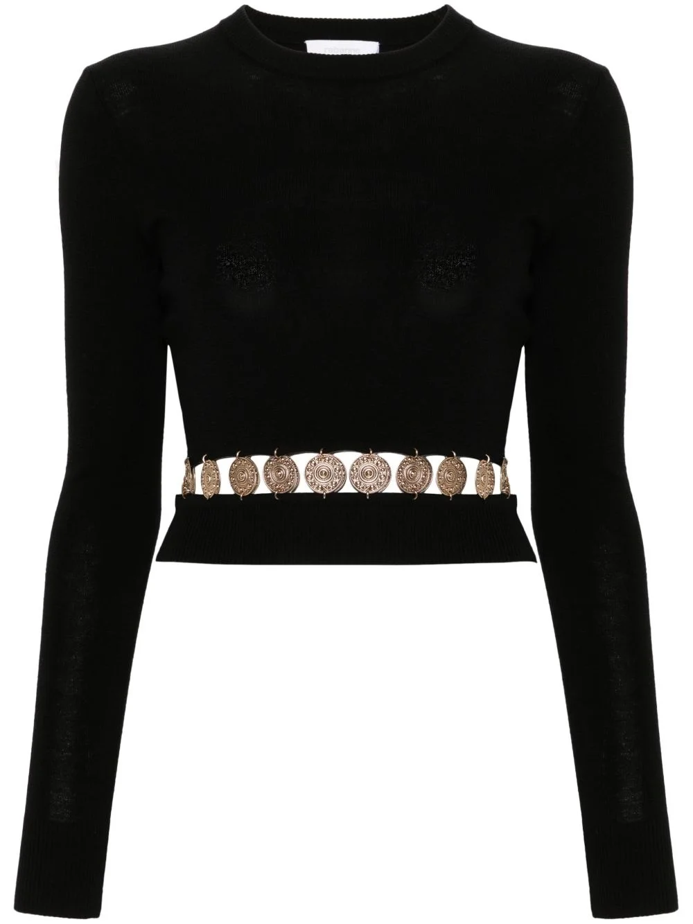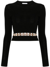 ribbed-knit studded top Highlights - Black - Wool-silk blend - Ribbed knit - Gold-tone stud embellishment - Crew neck - Long sleeves - Cut-out detailing - Ribbed cuffs and hem Made in Italy Composition Wool 75%, Silk 25% SIZE & FIT Model measurements Height 5 ft 10 in(1.78 m) Bust/Chest 32.67 in(83 cm) Hips 35.43 in(90 cm) Waist 23.22 in(59 cm) FittingInformation Designed for a slim fit that sits just away from the body offering a close yet comfortable fit Cropped in length Made from a midweight fabric This piece fits true to size – take your usual size