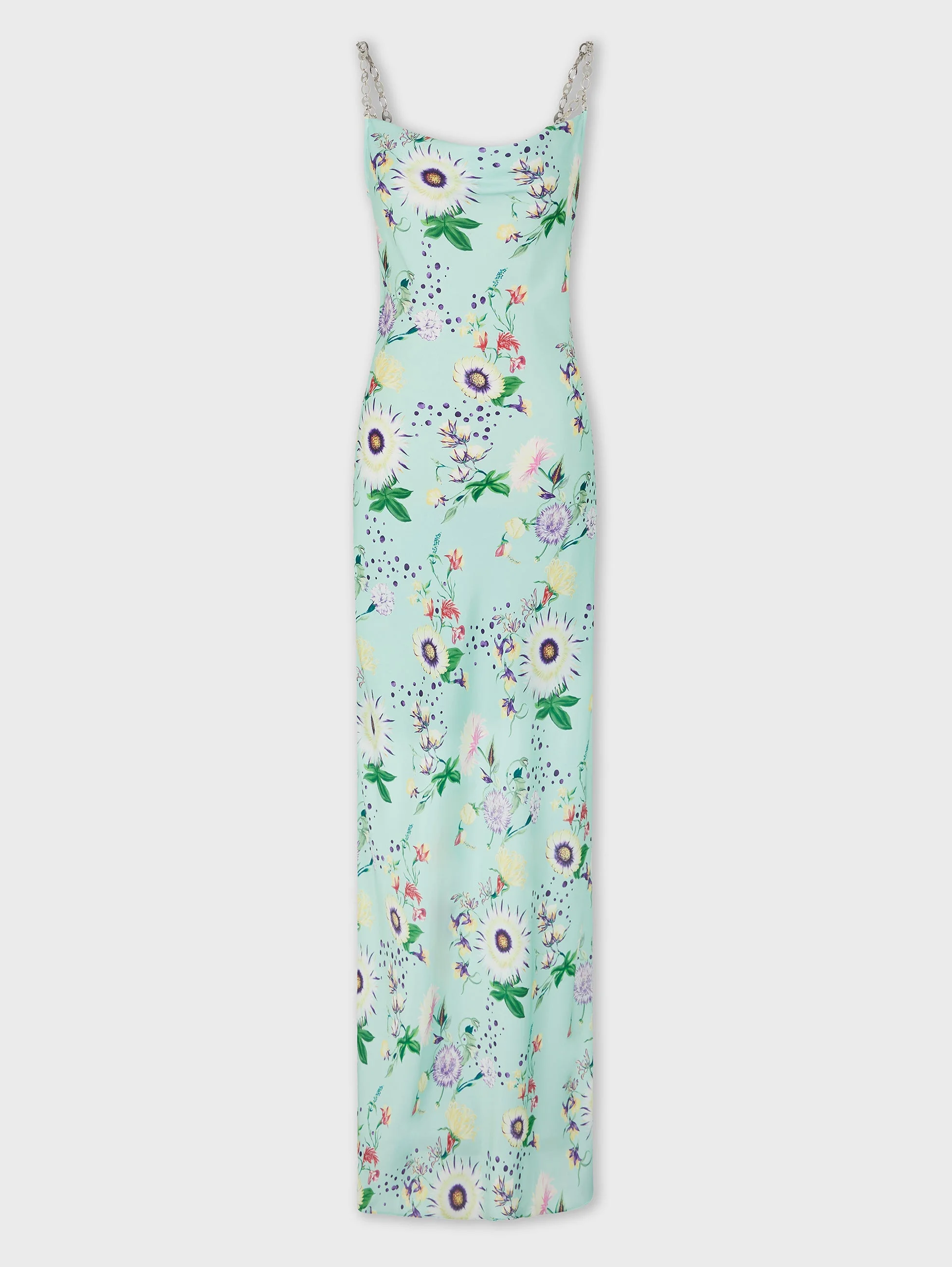 Long satin dress with floral print and silver chain details. - Color: Green / Purple / Orange - Sleeveless - Cowl neck - Long dress - 100% Polyester - Made in Tunisia Size & Fit - Model's height: 180 cm / 5ft 11in - Model wears a size FR 36 / UK 8 / US 4 - This style is true-to-size - We recommend your usual size.