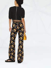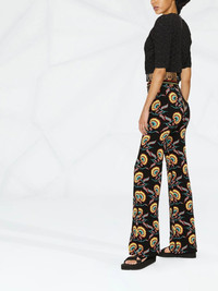 floral-print trousers Paco Rabanne's trousers are decorated in an abstract floral print reminiscent of '60s patterns. The flared leg further contributes to the retro aesthetic. Imported Composition Viscose 82%, Polyester 18% SIZE & FIT Model measurements Height 5 ft 10 in(1.78 m) Bust/Chest 30.31 in(77 cm) Hips 36.61 in(93 cm) Waist 24.8 in(63 cm) Measurement INSIDE LEG 31.49 in(80 cm) HIPS 31.49 in(80 cm) WAIST 22.83 in(58 cm) FittingInformation This piece fits true to size. We recommend you get your regular size Designed to be fitted at the waist and through the thigh, loose from the knee Made with a mid-weight fabric