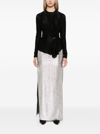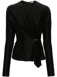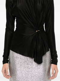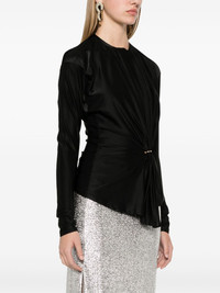 gathered-detail top Highlights - Black - Stretch-design - Gathered detailing - Draped detailing - Ring hardware detailing - Round neck - Long sleeves - Asymmetric hem - Concealed rear zip fastening Imported Composition Viscose 90%, Spandex/Elastane 10% SIZE & FIT Model measurements Height 5 ft 9 in(1.75 m) Bust/Chest 31.88 in(81 cm) Hips 34.64 in(88 cm) Waist 24.01 in(61 cm) FittingInformation Designed for a slim fit that sits just away from the body offering a close yet comfortable fit Made from a midweight stretch fabric, this piece offers elasticity and flexibility when worn This piece fits true to size – take your usual size Washing instructions Dry Clean Only