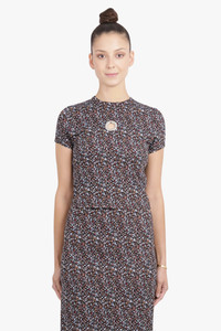A modern statement piece, this short-sleeve tee showcases an all-over geometric mosaic print that brings depth and dimension to its streamlined silhouette. The design is punctuated with a bold circular silver hardware detail at the neckline, adding a sculptural focal point to the otherwise fluid form. With its clean cut and contemporary patterning, this top strikes the balance between everyday wearability and elevated style. - Fabrication: 63% Viscose, 33% Cotton, 3% Polyamide, 1% Elastane - Short-sleeve blouse with a relaxed fit - All-over geometric mosaic print - Circular hardware accent at the neckline - Straight hem for a polished finish - Easy to pair with tailored trousers, skirts, or denim for versatile styling Pair this top with a pair of jeans or trousers for a casual everyday look. Size and Fit Tiah: Model is 178cm/5’9” and is wearing a size XS Model Measurements: Bust: 86cm, Waist: 69cm, Hips 90.5cm Fits true to size Measurements XS: Bust 84cm, Waist 74cm, Hip 74cm, Length 48cm S: Bust 86cm, Waist 76cm, Hip 76cm, Length 48cm M: Bust 90cm, Waist 80cm, Hip 80cm, Length 48cm